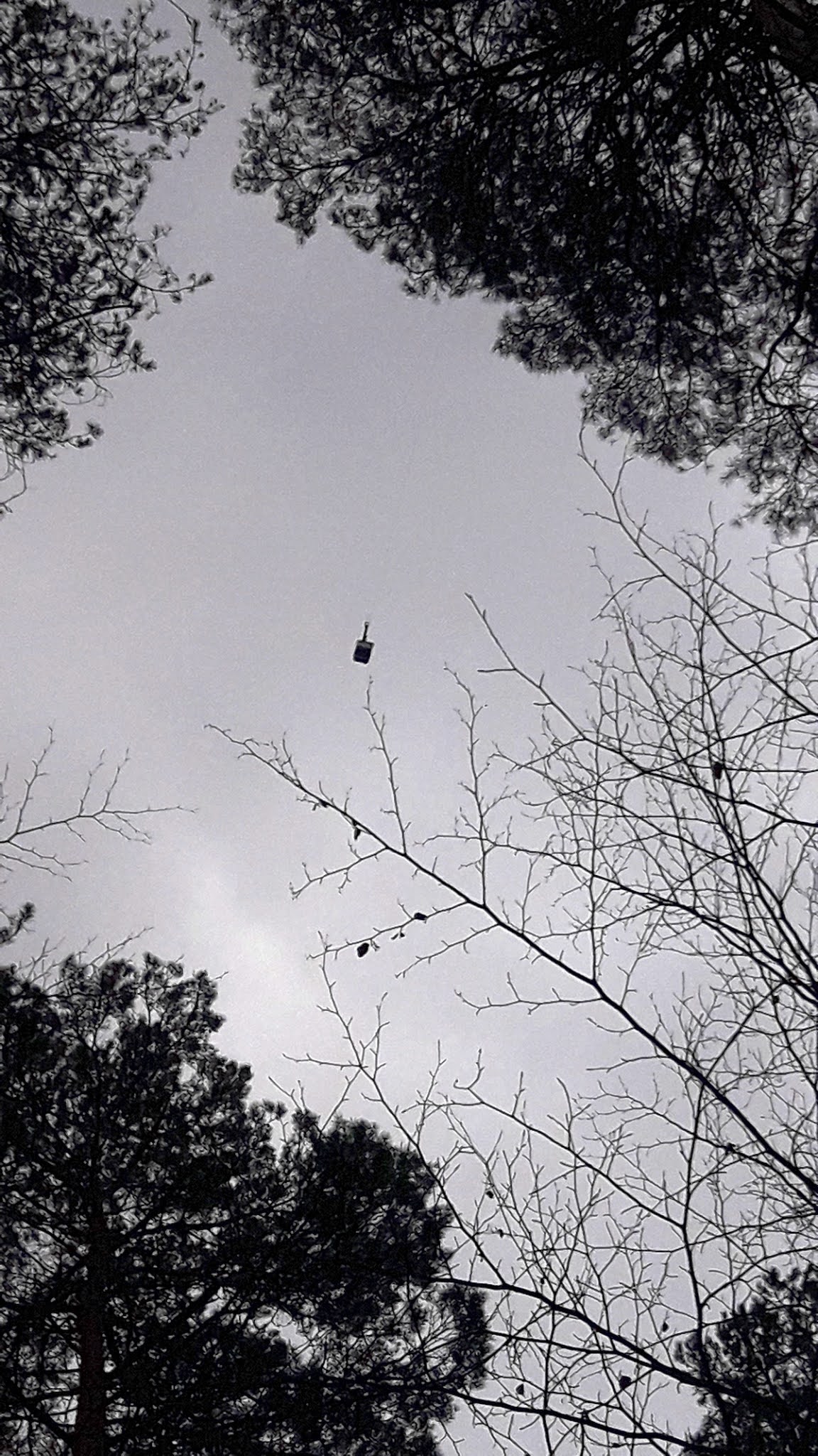Das erweist sich als machbar. Da ist einer dieser kleinen Hügel praktischerweise direkt unter dem Schirm positioniert. Viel Widerstand bietet die Schnur nicht. Das deutet darauf hin, dass die Schnur glatt durchgeht und nicht groß verhakt ist. Der Schirm wird gekappt - und tatsächlich fällt am anderen Ende die Sonde vom Baum.